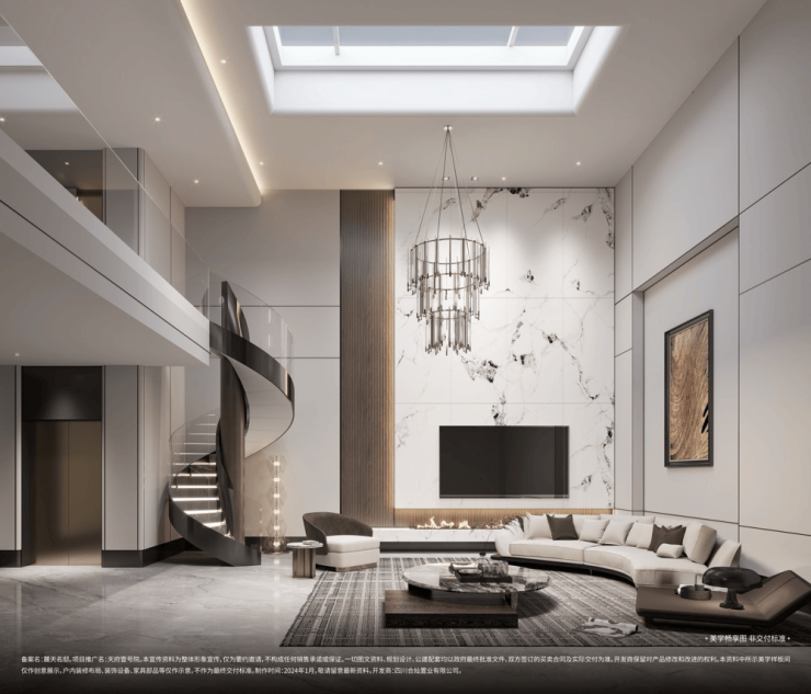 创新性四层空间规划:地下社交层配备影音室、酒窖等休闲空间;首层会客层设置双厅双厨;二层家庭层规划卧室区;顶层私密层打造主人专属空间。